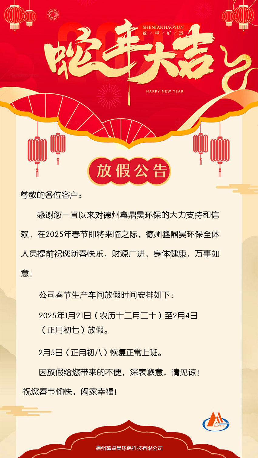 感謝您一直以來對德州鑫鼎昊環保的大力支持和信賴,在2025年春節即將來臨之際,德州鑫鼎昊環保全體人員提前祝您新春快樂,財源廣進,身體健康,萬事如意!